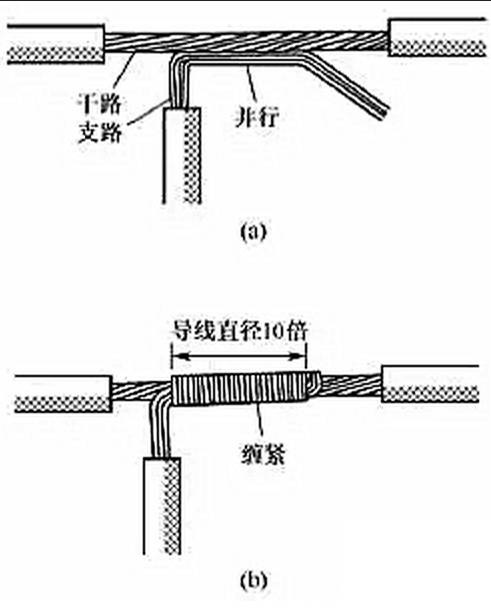 (4)多股銅導線的分支連接。多股銅導線的T字分支連接有兩種方法,一種方法是將支路芯線90°折彎后與干路芯線并行[見圖7(a)],然后將線頭折回并緊密纏繞在芯線上即可[見圖7(b)]。