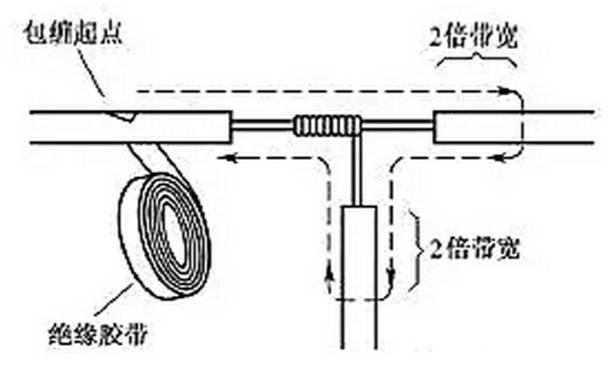 導線分支接頭的絕緣處理基本方法同上,T字分支接頭的包纏方向如圖21所示,走一個T字形的來回,使每根導線上都包纏兩層絕緣膠帶,每根導線都應包纏到完好絕緣層的兩倍膠帶寬度處。