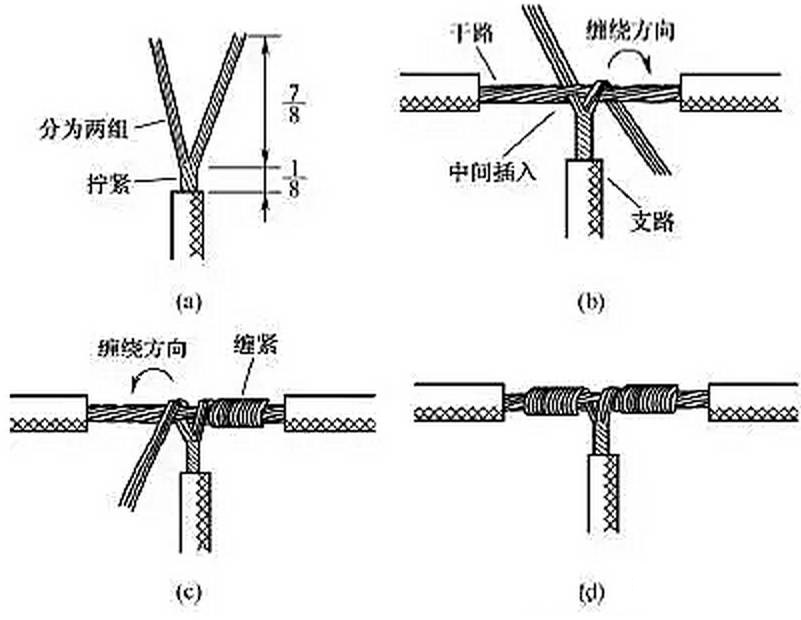 另一種方法如圖8所示,將支路芯線靠近絕緣層的約1/8芯線絞合擰緊,其余7/8芯線分為兩組[見圖8(a)],一組插入干路芯線當中,另一組放在干路芯線前面,并朝右邊按圖8(b)所示方向纏繞 4~5圈。再將插入干路芯線當中的那一組朝左邊按圖8(c)所示方向纏繞4~5圈,連接好的導線如圖8(d)所示。