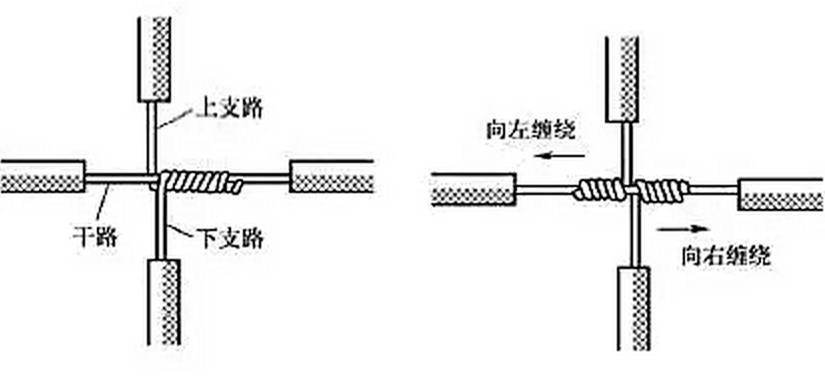 單股銅導線的十字分支連接如圖5所示,將上下支路芯線的線頭緊密纏繞在干路芯線上5~8圈后剪去多余線頭即可。可以將上下支路芯線的線頭向一個方向纏繞[見圖5(a)],也可以向左右兩個方向纏繞[見圖 5(b)]。